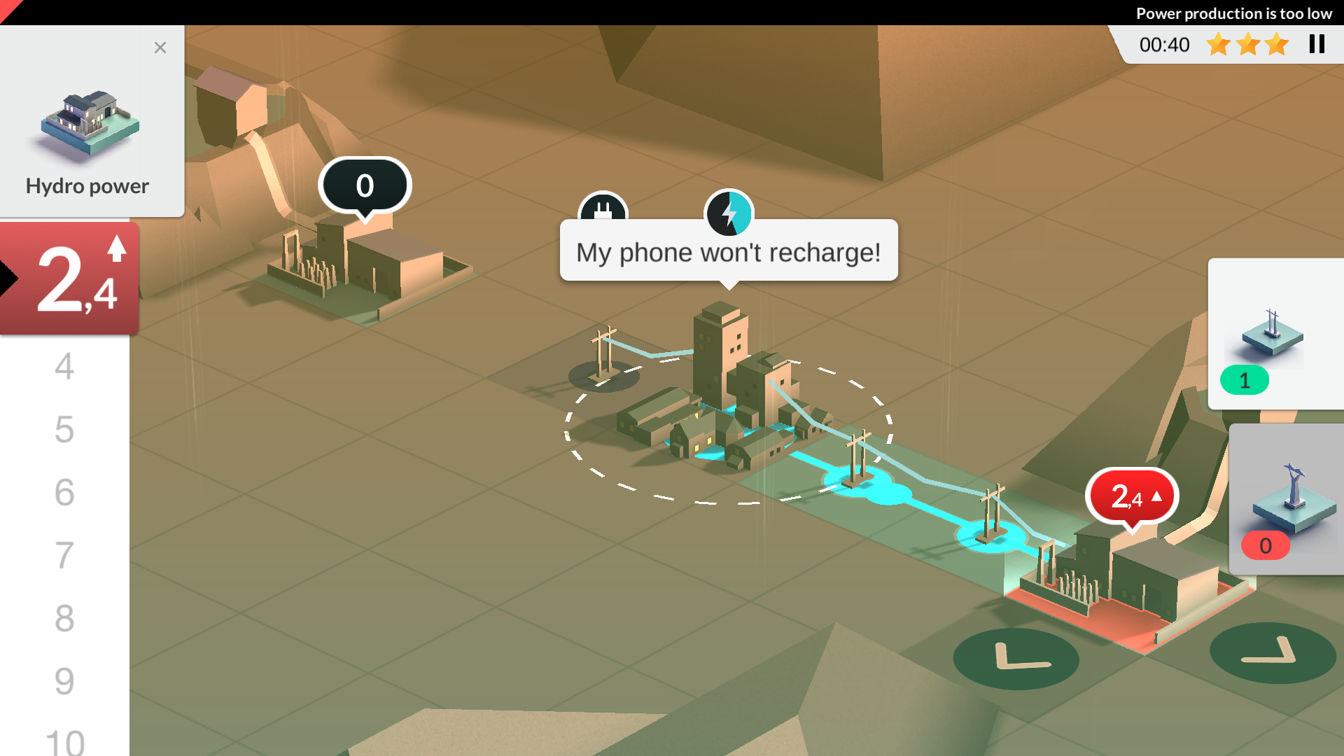 A simplistically stylized game about building and balancing a power grid to power cities and towns, while taking into consideration how to manage if a powerline is damaged in some way. The difficulty ramps up a bit inconsistently if you’re looking to three-star everything, and the effect you need to look out for are random, so you can’t guarantee that a fix will work on the next run. But as long as you power all points for long enough you clear a level and unlock the next, so stars are only time-based.